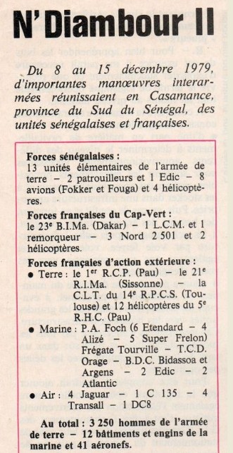 " En gros plan , la composition sommaire des Forces Franco Sénégalaises participant à cet exercice majeur en application des accords militaires de défense unissant les deux pays amis de longue date . Le 1° R.C.P. fournit un Groupe Etat Major autour du Colonel SENGEISEN chef de corps , la Compagnie de Commandement et des Services ( JAUNE) du Capitaine CAILLOT avec divers services, la 1° compagnie (VERT )du Capitaine AMARGER renforcée de Milans , la 2° compagnie (ROUGE ) du Capitaine DOUCET renforcée de Milans , Une Section de Mortiers Lourds , un poste de guidage avancé (PGA), un Groupe SANTE, et l' Aumônier Michel DUPUY"