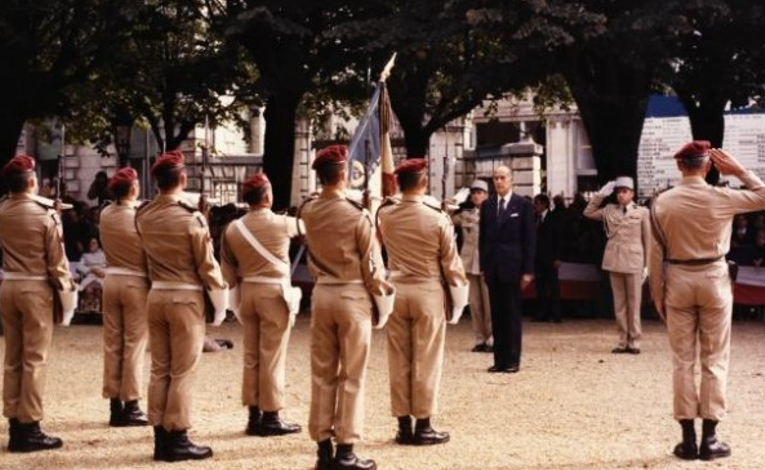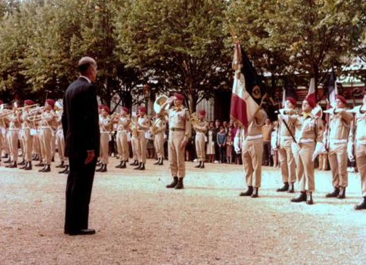 Le Président de la République, monsieur Giscard d'Estaing salue le Drapeau du 1° RCP, Chef de Corps Colonel Sengeisen.