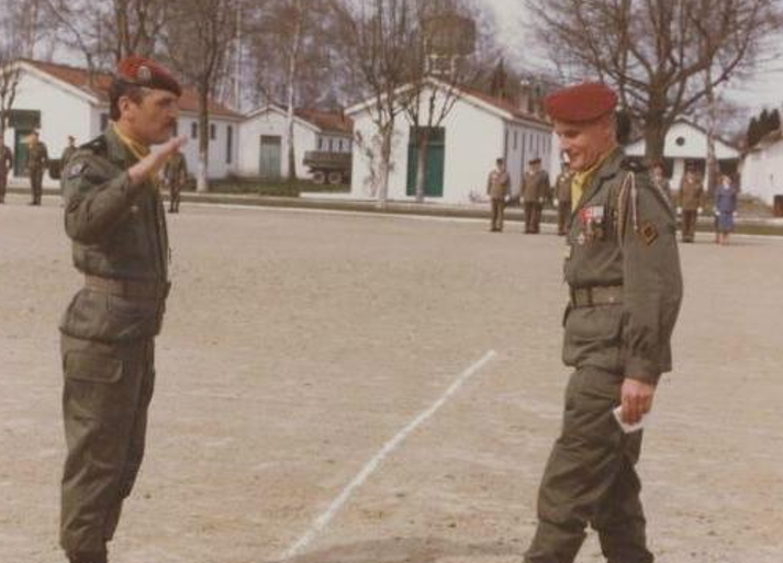 Le Colonel Sengeisen, Chef de Corps du 1° RCP lors de la prise d'Armes à l'occasion du départ de l'adjudant Chef Raymond Esplugas en 1980.
