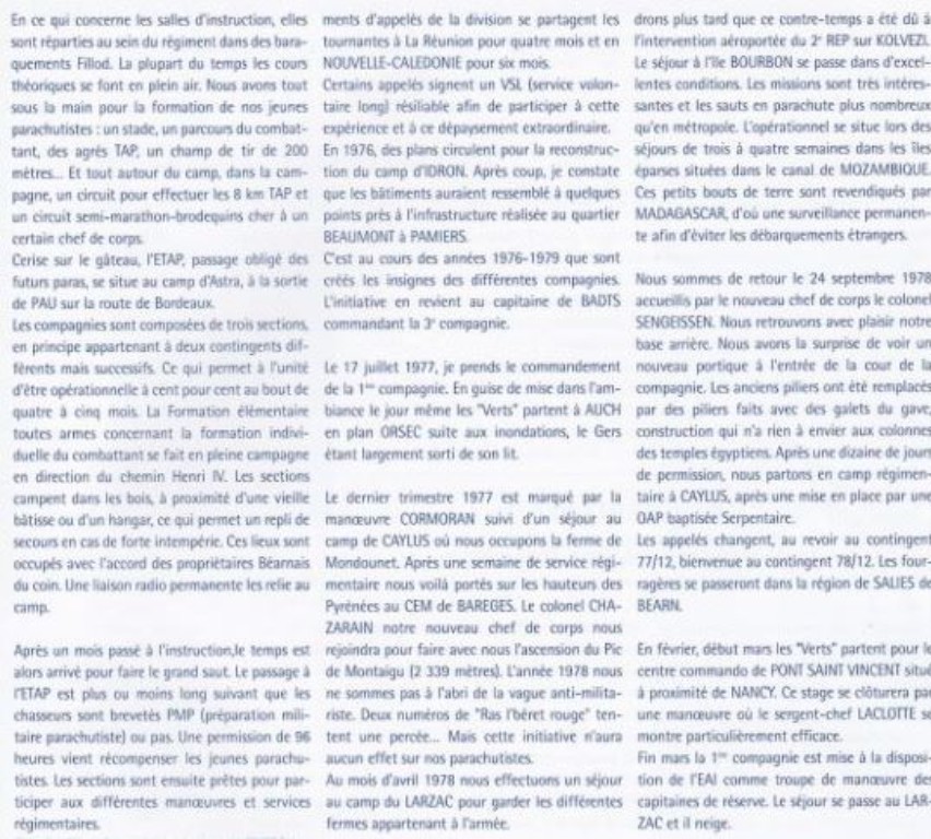 Fin juin 1984........Adieux du régiment à la ville de Pau ! Le Colonel Jean-Claude Cardinal - Chef de corps - le lieutenant Vitorio Conti - porte Drapeau - à la garde l'adjudant -chef Pierre Miralles , le sergent Clerc - à coté des Drapeaux des Associations le Colonel Lucien Chiama - Ancien du 1er RCP et du 9éme RCP , à l'époque Chef de corps de l' ETAP et certainement pour l'occasion DMD de la place de Pau - le lieutenant-Colonel Georges Pinatel - chef du BOI , faisant fonction de commandant en second - à la tête de la 2eme compagnie , le Capitaine Jean-Luc N' Guyen - le porte Fanion , le sergent-chef Astruc - puis derrière les chefs de section le lieutenant Perrier et l'adjudant-chef Adam.