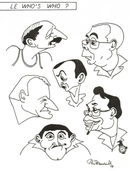Dessin de Gauche : Le capitaine Montech , commandant la 1ere compagnie ( vert ) en bas a gauche et l'adjudant Pujol. En haut a gauche, le général Leborgne. En haut a droite le capitaine Vally . Dessin de droite : l'adjudant chef Marty , gérant du mess. ( en haut ) , sur le cliché du bas on remarque le clin d'oeil à V G E et la date du 21 mai 1974. l'adjudant -chef SENECHAL Chef de Secrétariat des Services Administratifs.