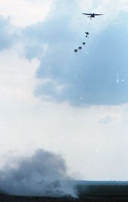 Avril 1988 : Séance de saut Régiment sur le zone de saut du Camp de SOUGE Michel BERNATETS a suivi le Chef de Corps . " Le Colonel JP VOLA ( chef de Corps) et le Lieutenant Colonel Christian CHANTECLAIR( Commandant en Second) se dirigent vers l' aire de réintègration des parachutes. " " Les mèmes tète nue .Au second plan descente sous voile gaines larguées .La zone de saut parait confortable " " Pose sportive du Chef de Corps .Belle charrette dans le ciel " " Michel BERNATETS ne peut s' empècher de profiter de l' occasion pour prendre des clichés artistiques . Le parachute qui s' affale mollement est un EFA 72-12 Il avait fallu ajouter une résille tout le long du bord d' attaque ,ce dernier ayant la facheuse tendance à rester collé au moment de l'ouverture .D'une surface d' environ 70 m2 ce parachute offrait un meilleur confort et permettait l' emport d'une charge supèrieure à celle du 60 m2 " Mai 1988 : Essais de photos sur le Drapeau du 1° R.C.P. " Le Drapeau transcendé par un soleil rayonnant . Ce Drapeau n' est plus en service .Il a été remplacé par un nouveau Drapeau confié à la garde du 1° R.C.P de PAMIERS -période des Engagés Volontaires et des OPEX " " Le Drapeau entouré des Fanions d' unités , avec et sans le filtre soleil .C'est finalement la photo sans filtre à effets spéciaux qui sera retenue par le Chef de Corps .L'Emblème et les Fanions sont présentés à l' avers . A gauche du haut vers le bas :C.A. C.C.S. 12° Cie . A droite du haut vers le bas :1° .2° .3°.4° Compagnies . Ces Fanions sont décrits à la rubrique FANIONS du 1° RCP sur ce même site. 26 Mai 1988 : Présentation au Drapeau et remise des Fourragères au contingent 1988 / 04 " Revue des troupes par le colonel JP VOLA accompagné du Capitaine MASSON . Le Capitaine SECHEPINE commandant la 12° Compagnie (ORANGE ) et son Fanion au modèle 1972 ( revers tranché de bleu clair à la hampe et de rouge aux parties flottantes) " Honneurs au Drapeau et sa présentation au Contingent 1988/04 .Cette cérémonie consacre l' entrée des jeunes Parachutistes dans l' ordre de bataille du Régiment en cas de conflit armé " " Au centre de la Place JEBSHEIM le Chef de Corps prononce une allocution sur le symbole du Drapeau et la signification des Fourragères .Au coté gauche le poignard USM 8 réglementaire " " Remise des fourragères aux appelés Volontaires Parachutistes du contingent 1988/04 ,opération pour laquelle les cadres du Régiments sont assistés par des anciens du 1° RCP " " Le Lieutenant Colonel Ch CHANTECLAIR repère le photographe .Le Capitaine G.PERIE (ROUGE) rejoint son emplacement sur les rangs" " Le Chef de Corps décore trois Chasseurs Parachutistes de la Médaille de la Défense Nationale " " Derrière le Drapeau il semble que ce soit la 2° Compagnie qui ouvre le défilé. La Musique de la RMD de BORDEAUX joue une marche ; Des deux cotés de l' estrade les nouveaux décorés ainsi que les anciens avec le Drapeau de l' Amicale des anciens du 1° RCP " " Il semble qu' à la 2° compagnie succède la 12° Compagnie"