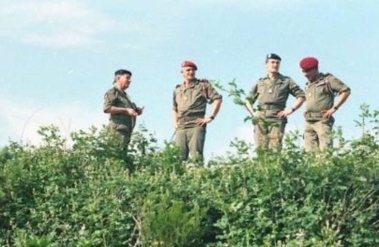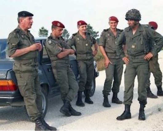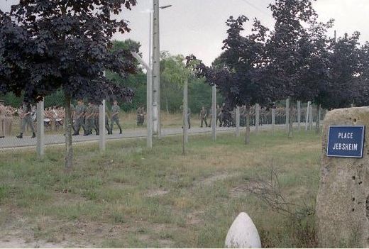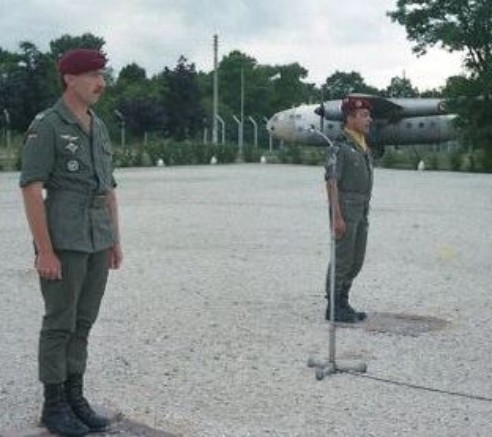 " Depuis un observatoire naturel le Général GRANGER, Lieutenant Colonel BRESSE Chef du BOI, un officier d' Etat Major ,Le Colonel JP VOLA .suivent le largage d'un Sous Groupement Aéroporté sur la zone proche du Quartier SAUVAGNAC . " Le spectacle ne laisse pas indiffèrent le Général Inspecteur qui est un vieux parachutiste Il a succèdé au Capitaine BIZARD au commandement de l' Escadron du 1°R.C.P. en ALGERIE Il a aussi commandé le 9° R.C.P.à TOULOUSE" Exercice tactique " Interception d'un Lieutenant qui subit un interrogatoire un peu narquois " " Général GRANGER ,Colonel JP VOLA,Lieutenant Colonel Ch CHANTECLAIR Lieutenant colonel BRESSE. Pour avoir vécu à la mème époque ce type d'inspection , le rédacteur en avait conclus que le Général GRANGER vieux guerrier accueillait avec bonhomie tout ce qui lui était présenté mais n' aimait pas trop que l'on tente de le bluffer " Chaîne de décontamination nucléaire , biologique , chimique . " Accès au circuit de décontamination du Régiment Tous les matériels souillés sont nettoyés " " Pour les parachutistes un circuit balisé est organisé " " Les vêtements contaminés sont déposés à l' entrée du circuit et après la décontamination corporelle les parachutistes perçoivent des vètements propres " " Le général s' avise que ses rangers sont maculées de boue ...il en profite pour tester une lance de décontamination et du coup nettoyer ses chaussures " Juin 1988 : Séance photos pour préparer la Passation de Commandement de la Compagnie d'.Appui.(BLEU) " A gauche le Capitaine CHAUDRON quittant son commandement à droite le Capitaine THUET prenant le commandement de la Compagnie d' Appui - BLEU - Les Sections sont représentées par l' armement de leur spécificité Un mortier de 120,un canon de 20 anti aérien , une jeep Milan missile anti char Le Fanion est celui créé en ALGERIE avec la devise NE PAS SUBIR" Voir à ce sujet Fanions du 1° RCP sur ce même site. " Dans les coulisses de l' atelier photo...Visiblement le filtre à effets spéciaux ne convient pas " Juillet 1988 : Fraternisation Franco - Allemande à l'issue de l' Exercice COLIBRI " Prise de commandement conjointe alors que les couleurs Allemandes et Françaises sont prètes à être montées Sur la façade de la tour de commandement du 1° RCP les insignes du 1° RCP, de la 11° Division Parachutiste , du 144 Régiment d' Infanterie (réserve ).Au pied du mat des Couleurs la plaque d'inauguration de la Place JEBSHEIM ( Colonel A.FAYETTE au CAMP d' IDRON) " Revue des troupes " La préséance est dévolue au Commandement Français pour passer en revue les Parachutistes Allemands .Colonel JP VOLA Chef de Corps suivi du Lieutenant colonel Ch CHANTECLAIR Commandant en Second " " La préséance est dévolue au Commandement Allemand ( Lieutenant Colonel )pour passer en revue les Parachutistes Français . Successivement I° Compagnie VERT Capitaine DELACHESNAY 2° Compagnie ROUGE Capitaine G.PERIE" Cérémonie des Couleurs " Montée des Couleurs Françaises et Allemandes On apprenait (autrefois) que l'on devait, toute affaire ,cessante faire face à la direction d' ou provenait la sonnerie des couleurs " " Le symbole de la fraternisation est scrupuleusement mis en valeur " " Le partage de l'image est équitablement réparti " " Cadres sans troupe du 1°RCP .Rang de Parachutistes Allemands Au garde à vous ils serrent les poings " " Belle allure de ces Parachutistes " Allocutions " Chaque Commandant des Troupes prononce une allocution que l'interprète tête nue et barbu consigne sur un carnet " Remise des Brevets " Le Colonel JP VOLA remet son Brevet à un Adjudant Chef .Le Capitaine DELACHESNAY (VERT ) remet son Brevet à un Chasseur Parachutiste" " Le Capitaine G.PERIE ( ROUGE) est confronté à la difficulté de fixer un Brevet .Un Lieutenant de la 2° Compagnie face à un Parachutiste de grande taille .Ce sont deux caporaux auxquels ils remettent le brevet ." Les nouveaux brevetés à l'honneur " Visages impénétrables de deux soldats nouveaux Brevetés . La moustache semble à la mode chez les Parachutistes Allemands dans cette fin des années 80 . L' emplacement velcro libre est destiné à la fixation d'un tissu sur fond vert représentant un aigle de face ailes déployées Cet insigne est décerné aux militaires ayant atteint un certain niveau de qualification ( technique , sport , commandement ...) Trois niveaux se distinguent à la couleur de la broderie : Bronze , Argent ,Or" " Photos - souvenir devant le mat des couleurs au garde à vous ou bien au repos .Sur le beret l'insigne en métal des Chasseurs Parachutistes , très proche de celui de leurs origines. Un rapace qui fond du ciel .Le Brevet de Parachutiste Allemand est porté en tissu sur les treillis Le brevet en métal étant plutot dédié à la tenue de sortie " " Les Parachutistes Allemands portent divers insignes en tissu ou en métal ; .Le Drapeau Allemand sur les deux manches .Coté gauche de la poitrine le Brevet Allemand tissé en dessous duquel le Brevet Français .Pour certains un insigne représentant deux feuilles de chêne sur fond vert qui atteste d'un stage commando .Poitrine coté gauche insigne métal du 251 ° Bataillon de Chasseurs Parachutistes .Certains Chasseurs Parachutistes portent sur la manche un Brevet de Parachtiste Belge , d' autre sur le coté gauche de la poitrine un Brevet de Parachutiste U.S.L' aigle en dessous de la poche gauche est défini ci dessus ( niveau de qualification )" " C' est un fait régulièrement observé lors des remises de décorations ou de brevets ..Le récipiendaire regarde et souvent touche ce qu'on vient de lui remettre comme pour s' assurer de la réalité des faits l Sur la tenue de treillis nos camarades Chasseurs Parachutistes Allemands affichaient beaucoup d'insignes !!" Mise en place pour le défilé " Les autorités se dirigent vers l'estrade devant laquelle défileront les troupes .c' est à dire sur la route de l'