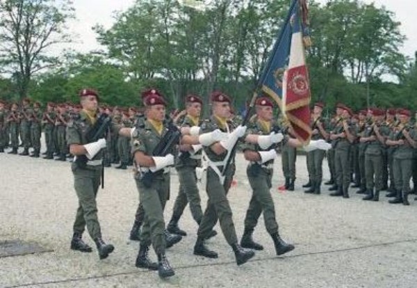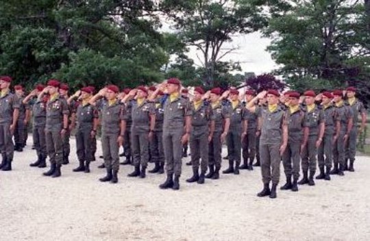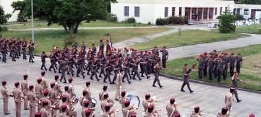 " Sur l' estrade traditionnelle du 1° RCP les Commandants des Troupes. En deuxième plan le Monument de DRAKKAR avec sa pierre sculptée et ses dalles de bétons entassées " " La musique de la RMD-CMD de BORDEAUX exécute une marche entrainante .Les musiciens portent les képis de leur arme d' origine " " Les Parachutistes Allemands défilent au "pas imbriqué" l' effet de masse est impressionnant . Le rédacteur se souvient de photos du 1° R.E.P. défilant de cette façon Bien entendu ce mode de défilé ne supporte pas le moindre décalage dans la cadence" " On distingue deux insignes de qualification ( poche gauche ) au niveau OR " " Les Parachutistes du 1° RCP forment une haie d' honneur On reconnait VERT et ROUGE " 8 Juillet 1988 : Passation de Commandement de la 2° Compagnie et de la 4° Compagnie. Une cérémonie commune avait été organisée pour ce double évènement .Par choix personnel nous traiterons compagnie par compagnie .Cette option a pour conséquence que toutes les séquences de la cérémonie ne peuvent pas être illustrées . La règlementation de l' époque ne fixait pas avec précision le cérémonial ,qui de ce fait dépendait de la seule appréciation du Chef de Corps . Passation de commandement de la 2° Compagnie ROUGE - entre le Capitaine G.PERIE (quittant) et le Capitaine ZARAGOZA (prenant ) " Le Porte Fanion de la 2° -Sergent Chef PAOLETTI - va remettre le Fanion au Capitaine G.PERIE .Le Capitaine G.PERIE rend le Fanion de la 2° Compagnie au Chef de Corps .Seuls ceux qui ont eu l'honneur de commander une Compagnie de Combat pour laquelle ils se sont pleinement investis savent ce que peut ressentir le Capitaine quand il rend le Fanion " " Le Chef de Corps se prépare à confier le Fanion de la 2° Compagnie au Capitaine ZARAGOZA .C' est la seconde fois que le Colonel JP VOLA porte ainsi , au centre d'une Place d' Armes le Fanion de la 2°. La première fois c' était le Colonel M.BRENAC qui l'avait confié en 1971 au Capitaine JP VOLA au Camp d' IDRON . Le Capitaine ZARAGOZA reçoit le Fanion de la 2° Compagnie " " Le Capitaine ZARAGOZA remet le Fanion au Porte Fanion " " Le Capitaine ZARAGOZA prend le commandement de la 2° Compagnie .La position hors des rangs du Fanion de Compagnie n' était pas réglementaire mais s' est petit à petit imposée . A gauche du Sergent Chef PAOLETTI le Lieutenant LEBLANC" " A l'invitation du colonel JP VOLA les deux capitaines échangent une poignée de mains avant le défilé ; La poignée de mains pourrait outre une démonstration d' amitié sceller une passation de pouvoirs excluant tout cadavre dans un placard .Défilé de ROUGE " " Les deux Capitaines ayant passé leur commandement G.PERIE et SERROR de part et d' autre du chef de corps pendant le défilé sur l' estrade des autorités et au moment du pot ." " Démonstration d' amitié entre les deux Capitaines après que le Capitaine ZARAGOZA ait prononcé une courte allocution rendant hommage au Capitaine G.PERIE" " Allocution du Colonel JP VOLA .Le Capitaine ZARAGOZA est breveté Instructeur Commando et Chuteur Operationnel " " Le Chef de Corps manifeste sa sympathie au Capitaine G.PERIE "