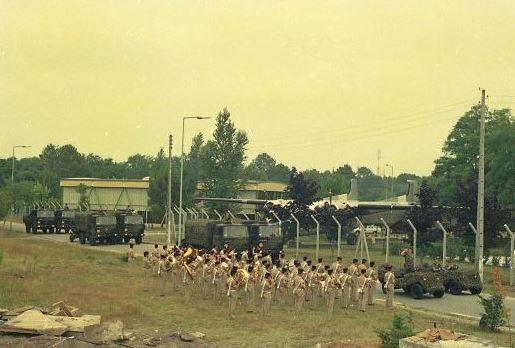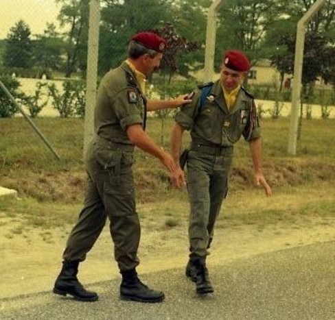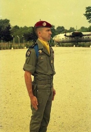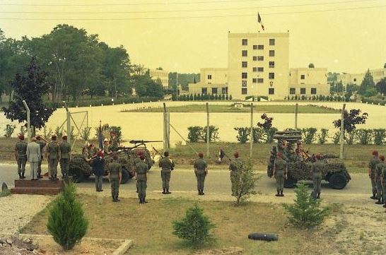 " Vue d' ensemble de la Place des Quinconces .Au premier plan les tribunes officielles .Le 1° RCP occupe le coté opposé aux tribunes .Le Général commandant la RMD vient de saluer le Drapeau du 1° RCP etant donnée la distance à parcourir la revue des troupes s' effectue à partir d'un véhiicule de commandement .Le Régiment aligne quatre compagnies à deux pelotons .La musique est à la hauteur de la route qui coupe la place en deux, perpendiculairement à l' axe de défilé " " Tout le Régiment est engagé sur l' axe de défilé .Comme c' est le cas à PARIS le dispositif s' ouvre en deux parties symétriques .Au premier Plan VERT amorce le mouvement de séparation " " Manoeuvre arfaitement réussie par la 1° compagnie .Le 1° RCP a fière allure . La route constitue le repére à partir duquel s' opère la séparation " 8 Aout 1988 : Passation de Commandement à la Compagnie d' Eclairage et d' Appui (CEA ) BLEU et à la 12° Compagnie ORANGE . Le Colonel JP VOLA avait regroupé à cette occasion l' accueil du Contingent 1988-06 et deux Passation de Commandement en une seule cérémonie . Premier tableau :Préliminaires à la C.A. " En présence du Drapeau ,la C.A. est rassemblée pour les Honneurs au Fanion ." " Les Sections se présentent à pied " " Un petit axe goudronné se préte parfaitement à cette présentation en ligne de Sections " " Le Sergent Chef Bernard VERET Porte une dernière fois avant son départ à la retraite le Fanion à la devise NE PAS SUBIR ." " Le Capitaine Henri CHAUDRON confie le Fanion au Sergent Chef BESSE de la Section de mortiers lourds. Ce sous Officier est breveté Chuteur Opérationnel, c' est lui qui sera le Porte Fanion du Capitaine THUET" Second tableau : Revue des Troupes. " Photo souvenir pour deux Appelés Volontaires Parachutistes de la Garde du Drapeau .Les véhicules des Sections parés pour le défilé sont en attente " " Plan sur les Anciens du 1° RCP avec le Drapeau de l' amicale ,à la droite duquel le Colonel ALLARD Président . Capitaine DELACHESNAIE Commandant la 1° compagnie avec son Porte Fanion " Troisième tableau : Présentation au Drapeau du Contingent 1988 / 06. " Le Drapeau du 1° RCP entre sur la Place JEBSHEIM ou les Honneurs vont lui être rendus Au centre ,en képi le Capitaine JULIEN du CM 57 ° Il porte l'insigne du CEC 30 de BONIFACIO dont il a commandé la CCS . Maître d' Armes c' est un vétéran d' ALGERIE " " Le Drapeau défile devant les rangs Les cadres sans troupe saluent " " Les jeunes Appelés Volontaires Parachutistes du contingent 1988 - 06 rendent pour la première fois les honneurs au Drapeau du 1° RCP " " Le photographe a saisi l'image rare et charmante d'une Assistante Sociale Militaire en tenue Elle porte l'insigne du Service Social des Armées" Quatriéme tableau :Remises de fourragères aux Appelés Volontaires du contingent 1988 - 06 " Un groupe de jeunes plus particulièrement méritants est mis à l'honneur et reçoit ses Fourragères des mains du Chef de Corps ou de quelques grand anciens vétérans de trois guerres " " Le Lieutenant Colonel Michel de FRITSCH ancien de BIZERTE et de la guerre d' ALGERIE a commandé la 3° Compagnie au Camp d' IDRON à la suite du Capitaine M.de WARREN." " Remise des Fourragères par des anciens d' INDO et d' AFN " Cinquième tableau :Remise de décorations " Le Colonel (ER) ALLARD Président de l' Amicale des Anciens du 1°RCP remet la Croix d' Officier de l' Ordre National du Mérite au Lieutenant Colonel (ER) Michel de FRITSCH qui reçoit les félicitations amicales du Colonel JP VOLA Chef de Corps .Ils ont commandé ensemble au CAMP d' IDRON l'un la 2° l' autre la 3° " " Le Capitaine THUET reçoit la Médaille du Service National du Chef de Corps .Sur l' épaule gauche du récipindaire un Brevet de Parachutiste BELGE Ce Brevet était assez convoité car il comprenait un saut de ballon Il porte au coté ce qui semble être une baïonnette de Famas " " Capitaine MAUREL (Chef de la SML puis Adjoint du Capitaine THUET auquel ,in fine ,il succédera ,)décoré de la Médaille du Service National par le Chef de Corps" " Capitaine BONNET décoré de la Médaille du Service National par le Chef de Corps" " Capitaine RANCHER décoré de la Médaille du Service National par le Chef de Corps " Sixième tableau : Passation de Commandement de la CEA entre le Capitaine H.CHAUDRON (quittant ) et le Capitaine THUET (prenant ) " Le Capitaine Henri CHAUDRON et son Porte Fanion se dirigent vers le centre de la Place JEBSHEIM. Le Capitaine Henri CHAUDRON prend le Fanion de la C.A. que porte le Sergent Chef BESSE .Tranché de Bleu et de Jonquille ce Fanion est très reconnaissable " " Le Capitaine Henri CHAUDRON rend le Fanion de la CA au Colonel JP VOLA L'échéance est inéluctable ,mais c' est un moment difficile " " Le Capitaine THUET reçoit le Fanion de la Compagnie d' Appui et se dirige vers le Porte Fanion " " Le Capitaine THUET confie le Fanion au Sergent Chef BESSE Le Capitaine Henri CHAUDRON prend concrétement conscience qu'une page vient de se tourner " " Le Colonel JP VOLA désigne le nouveau Commandant de Compagnie en prononçant la phrase d'intronisation " Septiéme tableau :Passation de Commandement de la 12° Compagnie entre le Capitaine SECHEPINE ( quittant ) et le Capitaine BOULLIER ( prenant) " Le Capitaine SECHEPINE prend le Fanion de la 12° Compagnie et se dirige vers le Chef de Corps ". " Après avoir rendu son Fanion au chef de Corps le Capitaine SECHEPINE assiste à l'intronisation de son successeur " " Le Capitaine BOULLIER entend la phrase " ..vous reconnaitrez désormais pour votre chef le Capitaine BOULLIER ici présent ......" " Le Capitaine BOULLIER ne cache pas sa satisfaction en recevant le Fanion de la 12° Compagnie qu'il va confier au Porte Fanion " " Le rituel est accompli le Porte Fanion retrouve le Fanion et la 12° compagnie a un nouveau chef " " Le Colonel JP VOLA lit l'Ordre du Jour résumant le commandement du Capitaine SE