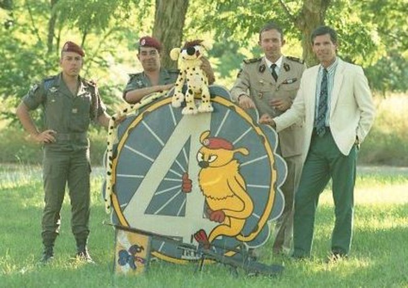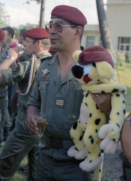 8 Juillet 1988 : Passation de Commandement à la 4° Compagnie entre les Capitaines SERROR ( quittant) et HECTOR ( prenant ) Le Capitaine SERROR rend le Fanion de la 4° Compagnie au Chef de Corps .Le Colonel JP VOLA confie le Fanion de la 4° Compagnie au Capitaine HECTOR qui quitte par la même occasion son poste d'adjoint du Capitaine Commandant la 2° Compagnie. " Le Chef de Corps lit l' Ordre du Jour du Capitaine SERROR -à sa droite- .Le Capitaine HECTOR prend le commandement de GRIS ." " Le Fanion de la 4° Compagnie a rejoint son emplacement à gauche du nouveau Commandant d'Unité .Il s' agit du Fanion au Vampire de la Seconde Guerre Mondiale . Le Fanion au Marsupilami n' avait pas refait surface en 1988 " (voir à ce sujet Fanions du 1° RCP sur ce même site. " Défilé de GRIS " A l'issue du défilé , en présence du Capitaine SERROR, le Colonel VOLA félicite le Capitaine HECTOR " Le Chef de Corps remet au Capitaine SERROR l'Ordre du Jour relatif à son temps de commandement .Le Capitaine HECTOR offre de la part de la 4° un "marsupilami d'honneur " au Capitaine SERROR.Des petites têtes blondes ne cachent pas leur joie à la vue de cette peluche géante" " Le Capitaine SERROR ( breveté Moniteur Parachutiste) ne se sépare plus de la sympathique mascotte de la 4° .Cette mascotte était quelque peu passée dans l'oubli entre le retour d' ALGERIE et le début des années 70 " " Le Capitaine HECTOR prononce une allocution . Au centre devant le Fanion, les Capitaines PERIE et ZARAGOZA . Le Capitaine HECTOR est breveté Chuteur Opérationnel " " Cette photo rassemble les Capitaines ayant commandé GRIS: Capitaine HECTOR,Capitaine SERROR ,Capitaine de SAINT GERMAIN ,Capitaine PRUT (de gauche à droite et par ordre d' ancienneté dans la fonction ) Devant eux le Fanion au vampire et le "marsup .." mascotte " 13 Juillet 1988 : Fête Nationale à BORDEAUX Siège de la Région Militaire de Défense (RMD)