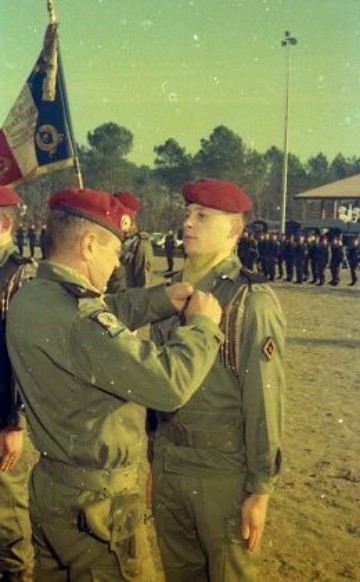 Revue du dispositif par le Chef de Corps. Les Drapeaux des anciens combattants et des Associations. Le Chef de Corps procède à la remise de la Médaille de la Défense Nationale à un certain nombres d' Appelés volontaires Parachutistes anciens.