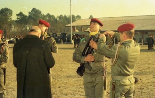 24 et 25 Janvier 1989 Tirs MILAN à CAYLUS . A ce sujet voir le reportage complet « LES MILANS » sur ce même site 25 Janvier 1989: Présentation au Drapeau et remise des fourragères au Contingent 1988-12 C'est à MARTIGNAS que se déroula cette cérémonie rituelle et cyclique . Vue d' ensemble du dispositif de la prise d' armes et accueil du Drapeau du 1°RCP .