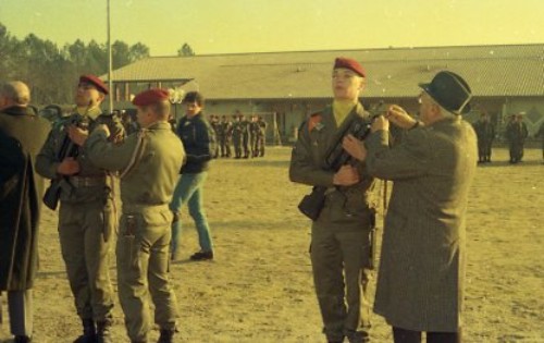 Un groupe de Jeunes Appelés Volontaires Parachutistes de la 1988-12 méritant se préparant à recevoir les Fourragères de la main des autorités. Les Foulards verts indiquent la 1° compagnie .