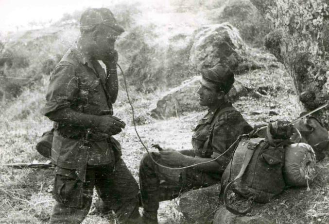 Le Caporal Chef BAJULS au milieu nue tète .A sa droite le Sergent A. MAZIARZ , tous deux chefs de groupe ou d' équipe portent une paire de jumelles .Notez la grenade fumigène accrochée à la boucle de poitrine des bretelles de suspensions .Cette grenade est destinée à signaler sa position ou à désigner un objectif ou encore à faciliter le poser d' un hélicoptère . Avant la fin de l'année 1959 l' ESCADRON mettra hors de combat deux rebelles dans la région de CHOUARIKH ,puis trois autres dans le DJEBEL TAFERSTAT enfin trois autres dans le BOUTOUAB . |