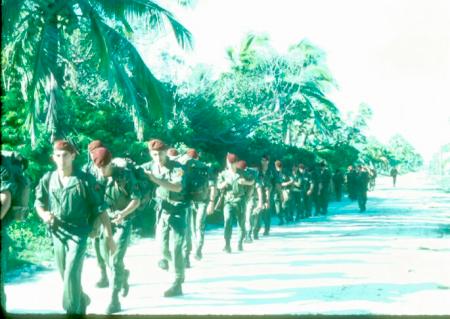 La manœuvre se déroula sur un rythme bon enfant .Elle avait surtout pour but d' affirmer la présence française et de montrer l' aptitude des forces stationnées à intervenir en tout point de l' Archipel Néocalédonien cette époques quelques villages de la cote ouest affichaient une attitude quelque peu hostile aux "zoreilles" ( les Français métropolitains sont également ainsi baptisés aux ANTILLES et à la REUNION ) mais nous étions loin des tragiques événements d' OUVEA .Les ROUGES n' ont pas eu à effectuer de maintien de l' ordre pendant leur séjour, tout au plus ont ils joué un rôle dissuasif en appuyant par leur présence l' action d' un Escadron de Gendarmerie Mobile .Néanmoins ils étaient prêts à intervenir et les sections avaient reçu de l' ESCADRON de GENDARMERIE MOBILE une formation de base aux techniques de maintien de l' ordre . | | |