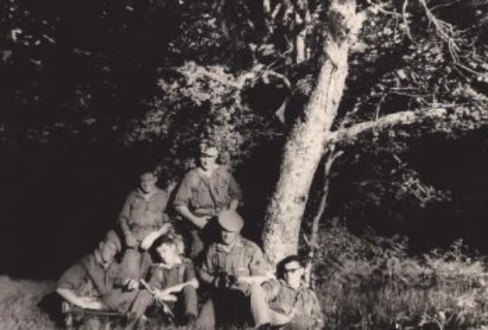 "Exercice dans la région de BAYONNE (19 mai 1966 ) Le groupe observe une pause casse croute au pied d'un chêne Au premier plan un réchaud à gaz compagnon inséparable du crapahuteur .Pause le long d'un chemin .Le pain vient probablement d' être acheté dans une boulangerie locale .Il est vrai que les biscuits dits pain de guerre manquent singulièrement d' attrait ."